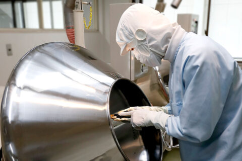製丸機で成型 …… 原料を回転させて、均一な丸薬にします。