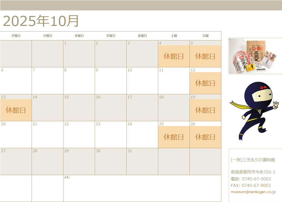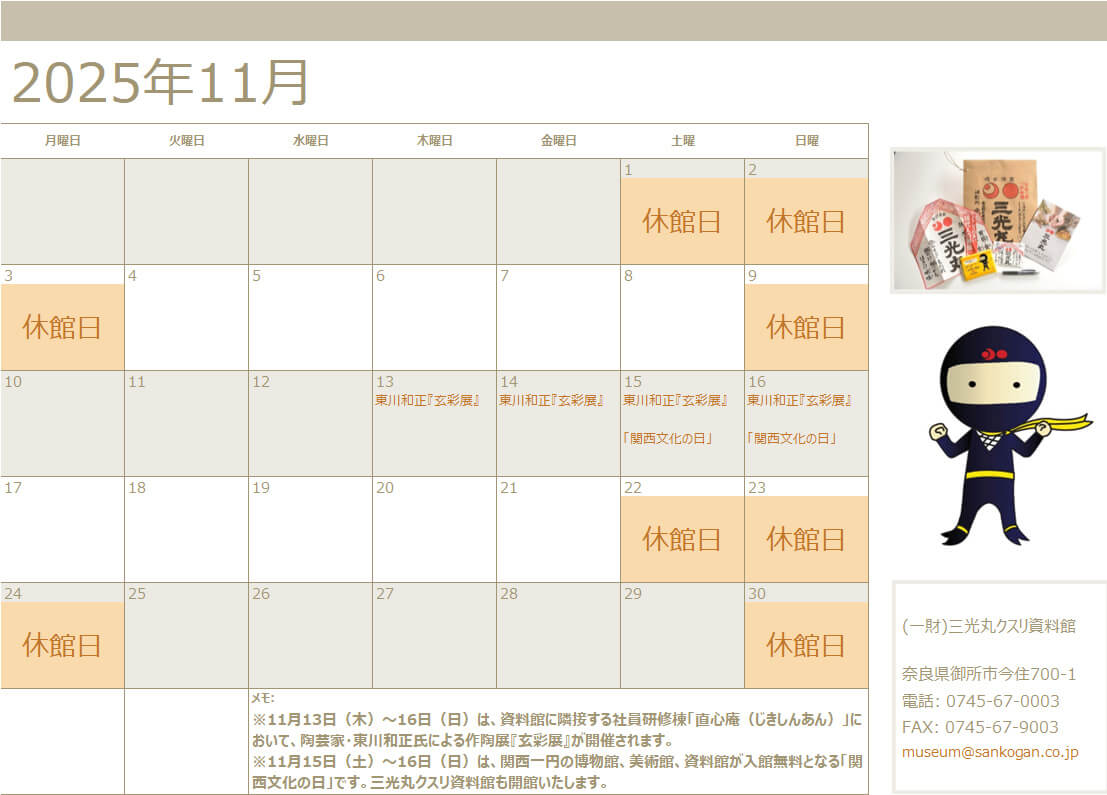 三光丸クスリ資料館は、これら先人たちが残した薬草と配置薬のさまざまな知識と知恵を知ると共に、はるか元応年間から製造され、七百年にわたって暮らしのなかで愛され続けてきた三光丸を通じて、配置薬販売の歴史や実際を知ることのできるミュージアムです。見たり聞いたりするだけではなく、薬草の実物や薬づくりの道具にふれたり、薬づくりを体験したり…、五感すべてを使って、いろいろな角度から「大和の薬」をお楽しみいただけます。